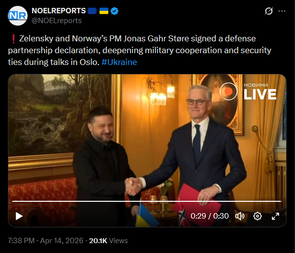 Zelensky and Norway’s PM Jonas Gahr Støre signed a defense partnership declaration, deepening military cooperation and security ties during talks in Oslo. #Ukrainehttps://x.com/NOELreports/status/2044123162984501269?s=20>14thhttps://files.catbox.moe/gcw26p.mp4Zelensky warned Russia could launch a large-scale overnight attack, with numerous Shahed drones already detected in Ukrainian airspace and possible missile strikes. #Ukrainehttps://x.com/NOELreports/status/2044124190354055648?s=20>14th