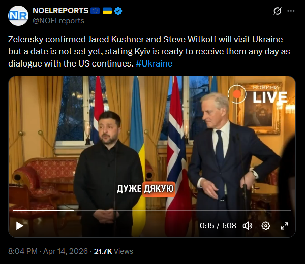 Zelensky confirmed Jared Kushner and Steve Witkoff will visit Ukraine but a date is not set yet, stating Kyiv is ready to receive them any day as dialogue with the US continues. #Ukrainehttps://x.com/NOELreports/status/2044129719684063414?s=20>14thhttps://files.catbox.moe/4nf7ig.mp4