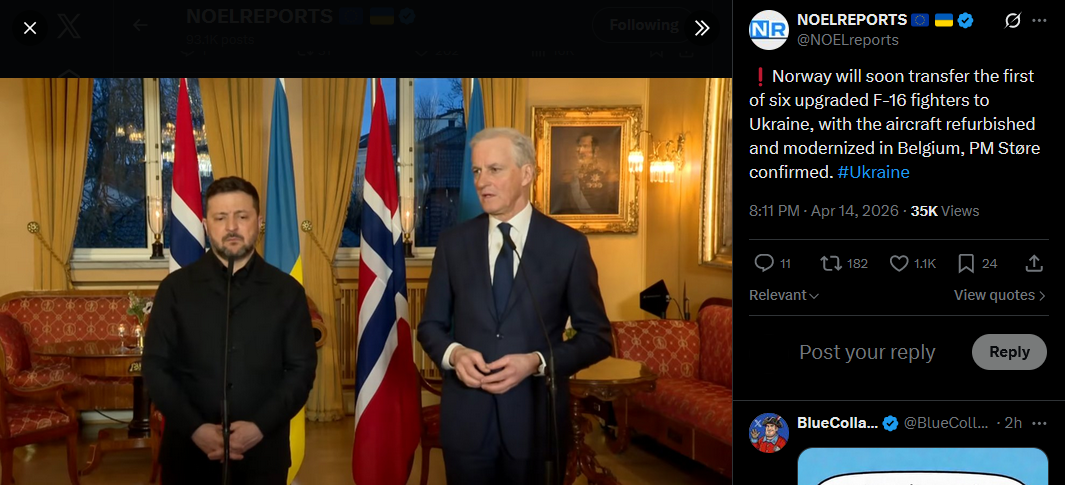 Norway will soon transfer the first of six upgraded F-16 fighters to Ukraine, with the aircraft refurbished and modernized in Belgium, PM Støre confirmed. #Ukrainehttps://x.com/NOELreports/status/2044131490624053443?s=20>14thUS reinstated sanctions on Russian oil after letting a waiver expire, targeting revenues from firms like Rosneft and Lukoil despite concerns Moscow can still bypass restrictions. #Russiahttps://x.com/NOELreports/status/2044133004675633574?s=20>14th
