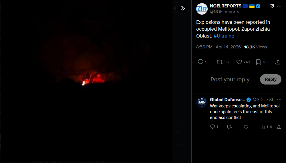 Explosions have been reported in occupied Melitopol, Zaporizhzhia Oblast. #Ukrainehttps://x.com/NOELreports/status/2044141176832381173?s=20>14th