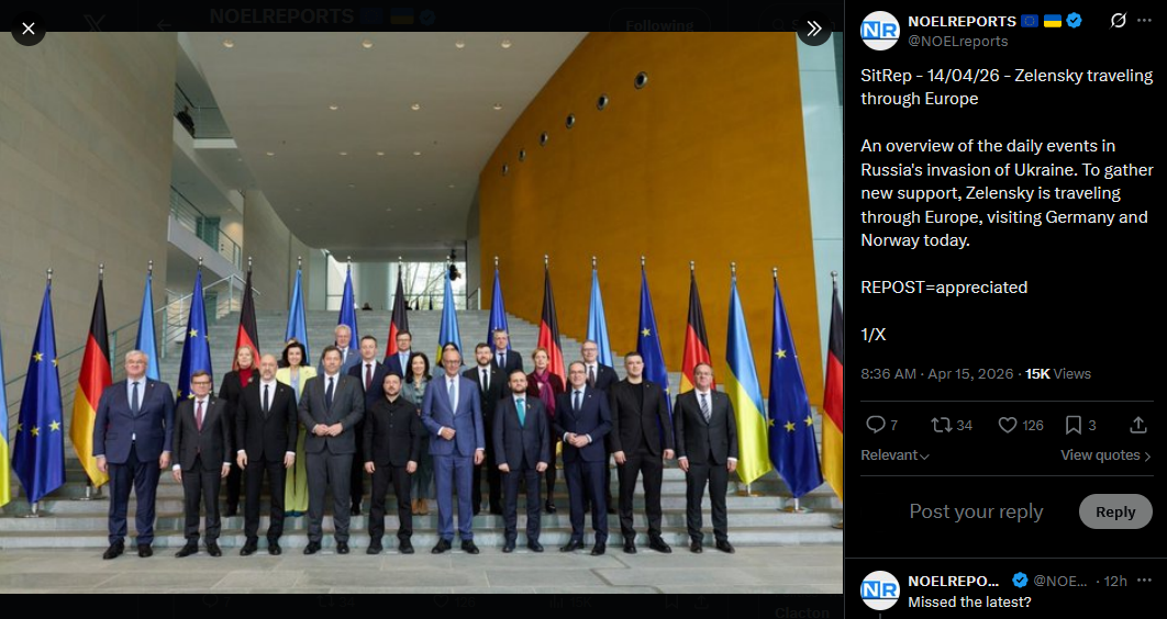 SitRep - 14/04/26 - Zelensky traveling through EuropeAn overview of the daily events in Russia's invasion of Ukraine. To gather new support, Zelensky is traveling through Europe, visiting Germany and Norway today.https://x.com/NOELreports/status/2044319055641739331?s=20