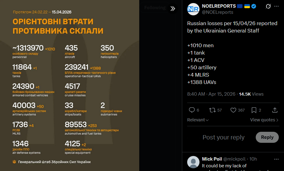 Russian losses per 15/04/26 reported by the Ukrainian General Staff+1010 men+1 tank+1 ACV+50 artillery+4 MLRS+1388 UAVshttps://x.com/NOELreports/status/2044319829222437097?s=20