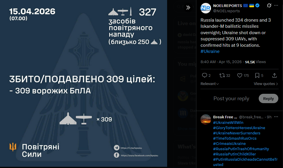 Russia launched 324 drones and 3 Iskander-M ballistic missiles overnight; Ukraine shot down or suppressed 309 UAVs, with confirmed hits at 9 locations. #Ukrainehttps://x.com/NOELreports/status/2044320065198161960?s=20>15th