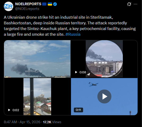 A Ukrainian drone strike hit an industrial site in Sterlitamak, Bashkortostan, deep inside Russian territory. The attack reportedly targeted the Sintez-Kauchuk plant, a key petrochemical facility, causing a large fire and smoke at the site. #Russiahttps://x.com/NOELreports/status/2044321822087270691?s=20>15thpic https://files.catbox.moe/z65n4g.jpgvideo 1https://files.catbox.moe/kdwawp.mp4video 2https://files.catbox.moe/o1ck6h.mp4video 3https://files.catbox.moe/i3l3tx.mp4