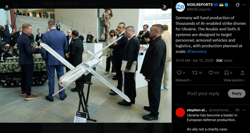 Germany will fund production of thousands of AI-enabled strike drones for Ukraine. The Anubis and Seth-X systems are designed to target personnel, armored vehicles and logistics, with production planned at scale. #Germanyhttps://x.com/NOELreports/status/2044344892415959438?s=20>15th
