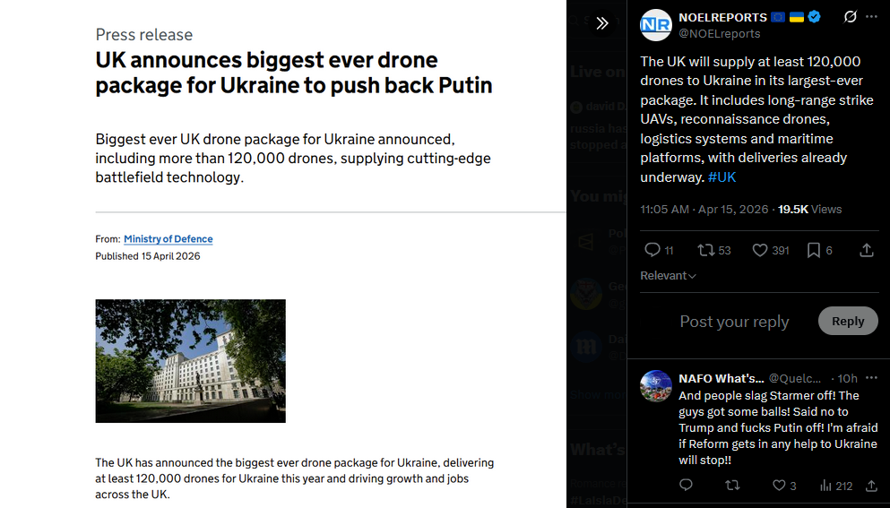 The UK will supply at least 120,000 drones to Ukraine in its largest-ever package. It includes long-range strike UAVs, reconnaissance drones, logistics systems and maritime platforms, with deliveries already underway. #UKhttps://x.com/NOELreports/status/2044356430967308778?s=20>15th