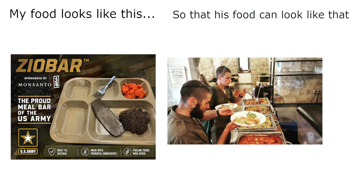 >>533321562You're a retard lol they only get steaks and lobster when they're about to put boots on the ground, outside of that and or thanks giving and Christmas, its slop as per usual