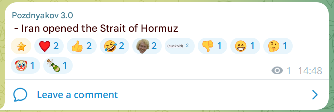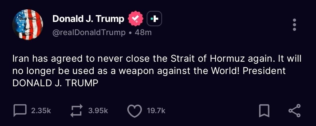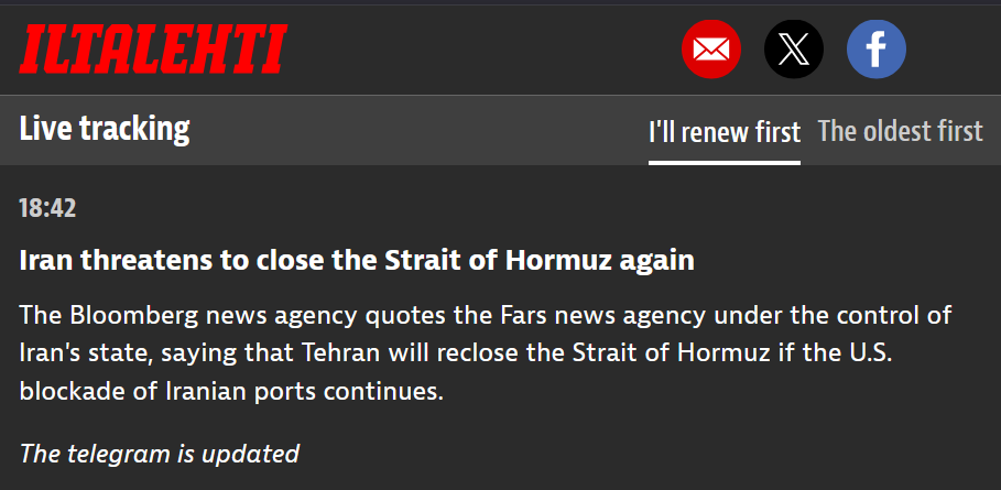 >>533327412not so fast sweatie>Iran threatens to close the Strait of Hormuz again>The Bloomberg news agency quotes the Fars news agency under the control of Iran's state, saying that Tehran will reclose the Strait of Hormuz if the U.S. blockade of Iranian ports continues.