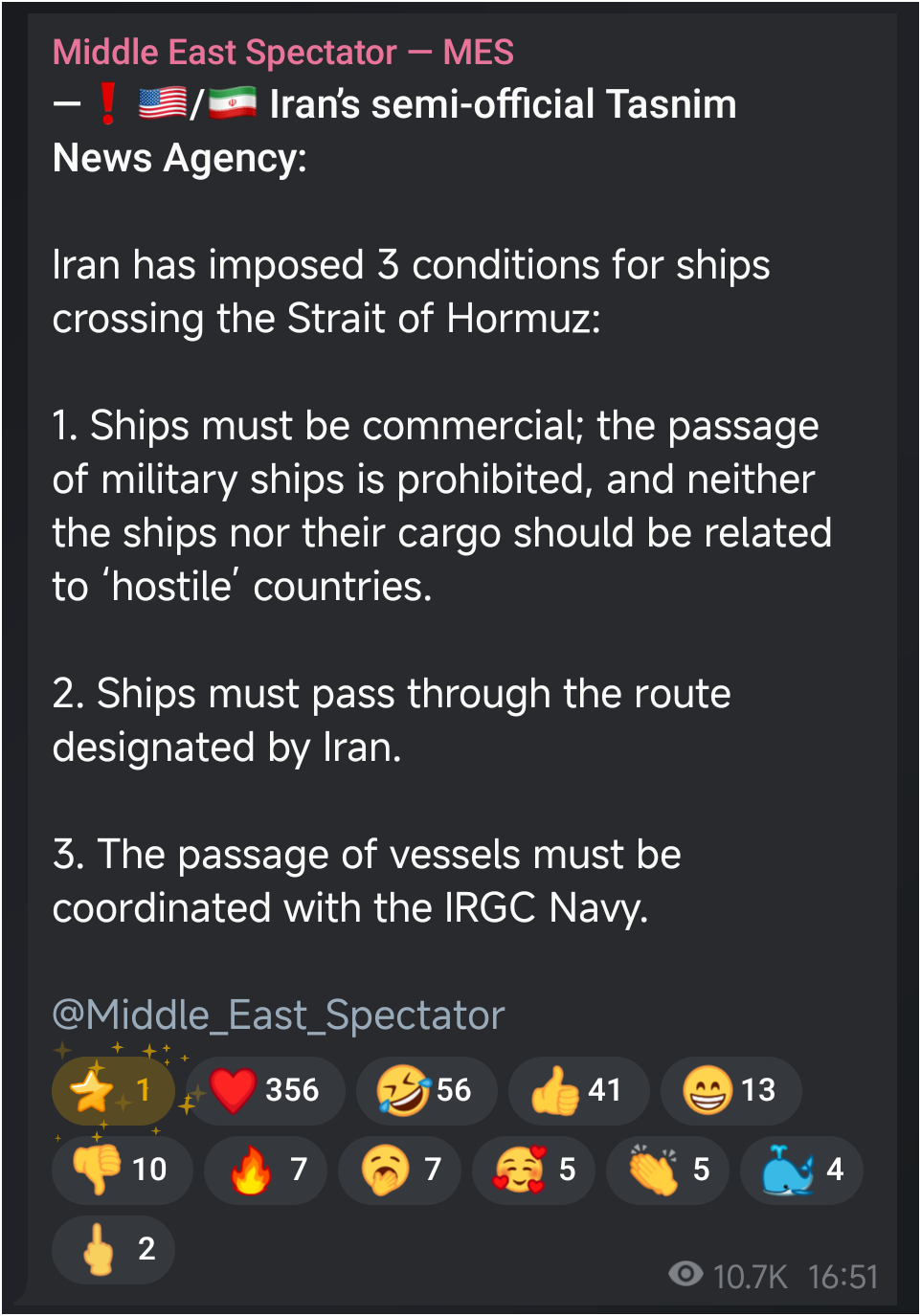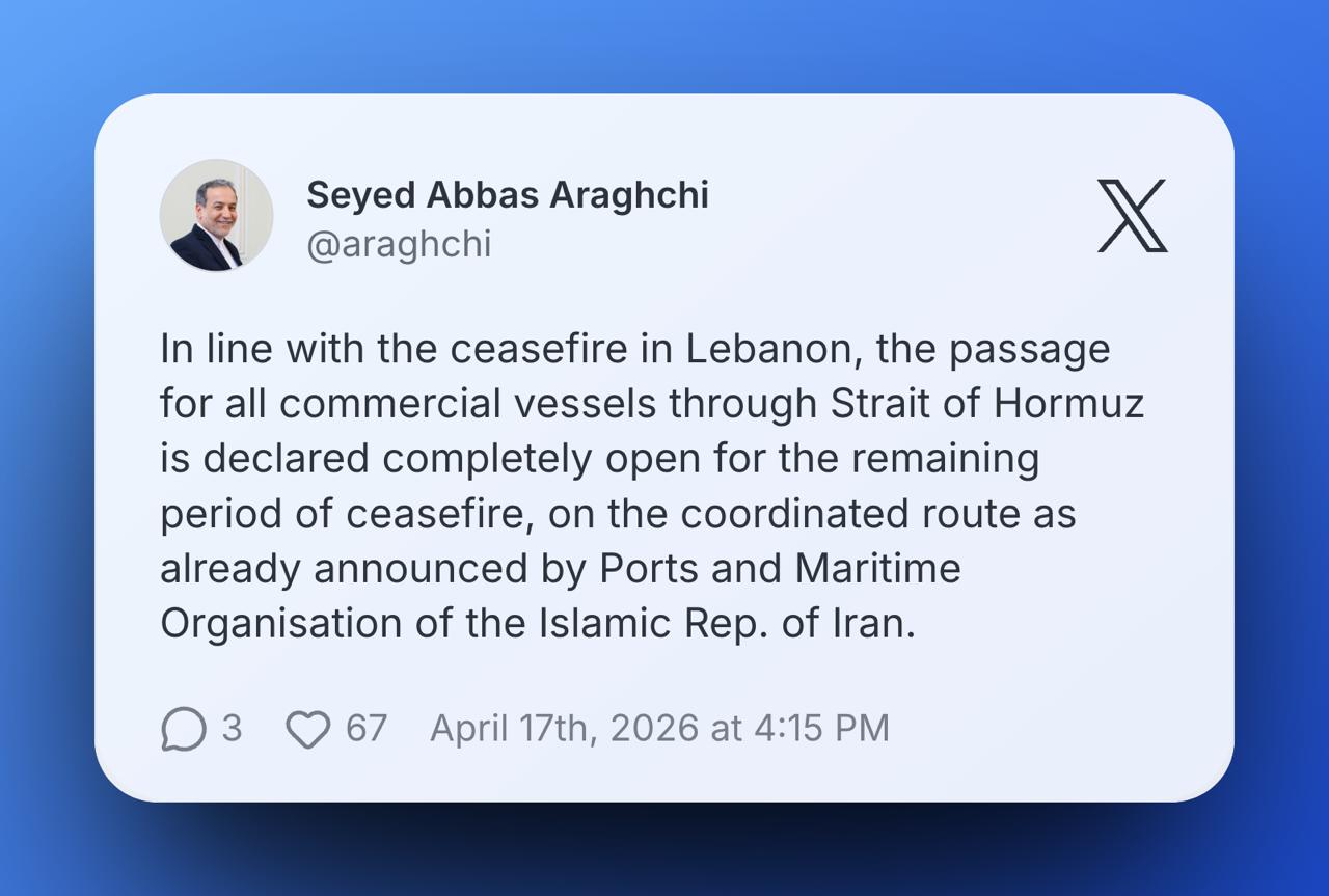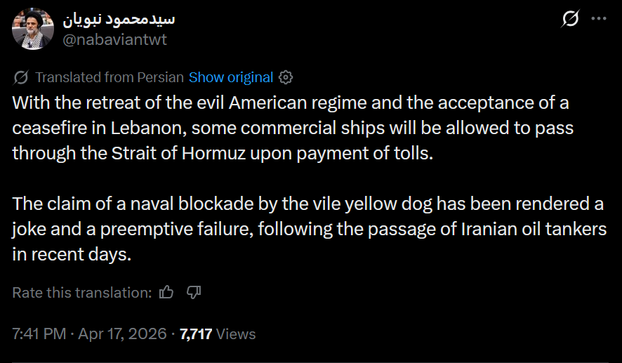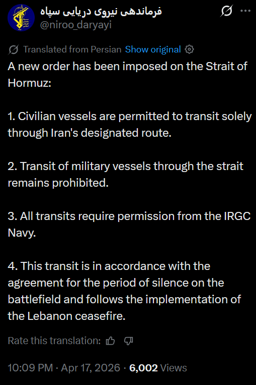 Per official account of IRGC Navy: >A new order has been imposed on the Strait of Hormuz:> 1. Civilian vessels are permitted to transit solely through Iran's designated route.> 2. Transit of military vessels through the strait remains prohibited.> 3. All transits require permission from the IRGC Navy.> 4. This transit is in accordance with the agreement for the period of silence on the battlefield and follows the implementation of the Lebanon ceasefire.https://x.com/niroo_daryayi/status/2045180391775191138