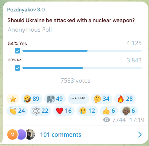literally every day now hohols upload videos of high value russian targets being destroyed. good thing russian government banned telegram to make sure all videos now are now pro-ukrainian. another genius move by the greatest and most competent MoD in modern history.