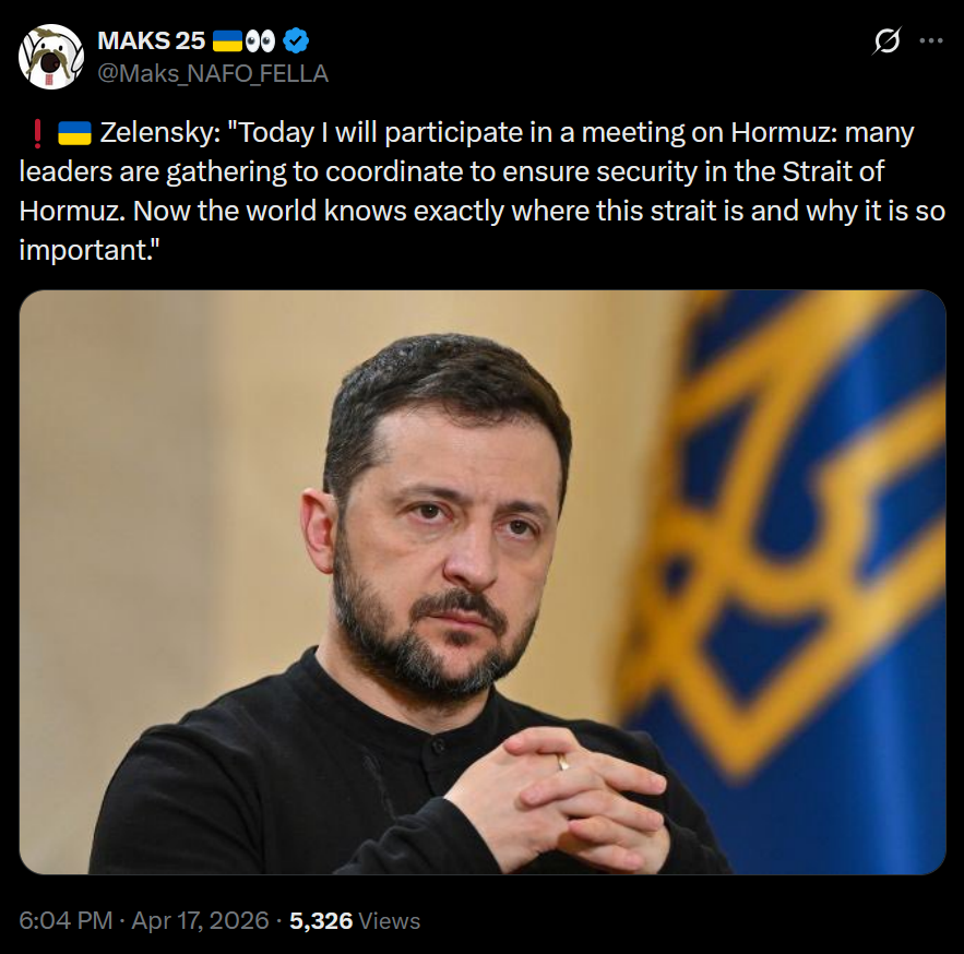 >Zelensky: "Today I will participate in a meeting on Hormuz: many leaders are gathering to coordinate to ensure security in the Strait of Hormuz. Now the world knows exactly where this strait is and why it is so important."DAI hormuz DAI