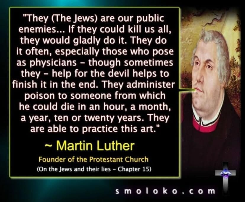 >>533319274Pope Leo is literally a mixed-race abomination with sephardic jewish rootsCatholic church has been infiltrated by jews for centuries now that is why Martin Luther created protestantism in the first place, although he only saw the corruption and not the jews behind it until his later yearsMartin Luther's instructions on how to deal with jews:1. Burn down Jewish schools and synagogues2. Drag Jews into barns and raze their homes3. Confiscate all Jewish religious literature4. Kill Rabbis who teach Judaism5. Kill Jews who travel on public roads6. Forbid Jewish usury and confiscate ill-gotten wealth7. Force Jews to manually labor to survive8. Ultimately drive Jews away from Christian landsmeanwhile the (((catholic))) pope says how we should make amends with jews and muslims and allow them into our landsyou know the very seat that crusades used to be launched against themits all corrupted to shit