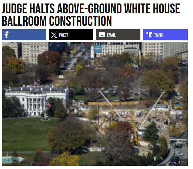 https://www.breitbart.com/news/judge-halts-above-ground-white-house-ballroom-construction/>“This is a mockery of our Court System! The Ballroom is deeply important to our National Security, and no judge can be allowed to stop this Historic and Militarily Imperative Project.”>The federal government has filed an appeal against the Thursday ruling.Trump can't stop losing.His ass is getting checked and balanced by federal judges.