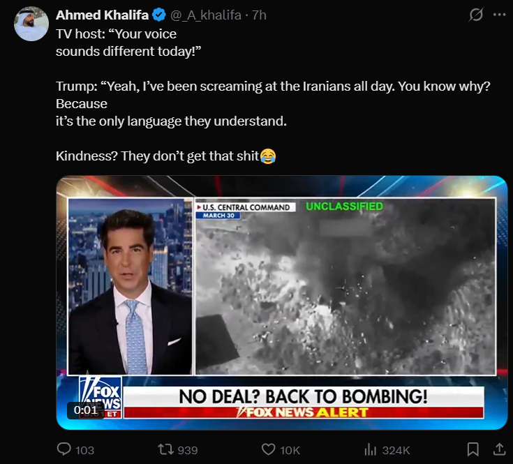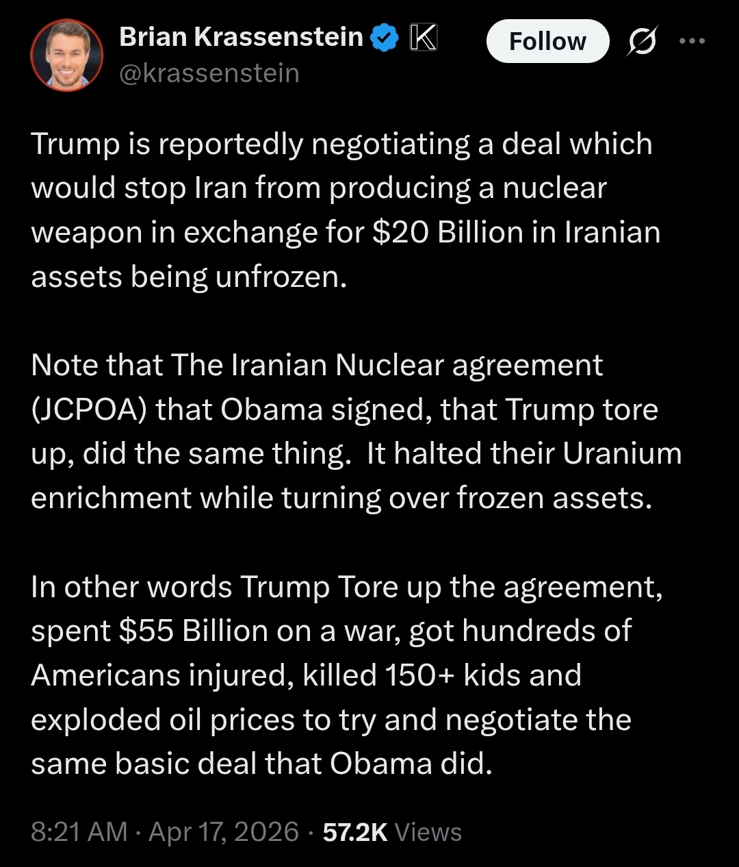 In seven weeks of Trump's "special 24-hour op" to overthrow Iran:>Allowed Israel to cuck him in to a war (per Rubio)>Uses it as a convenient way to avoid his pedophilia in the Epstein files>15 *confirmed* dead Americans, over 290 wounded>Unknown numbers of Americans captured>Trump says dead Americans "Is the way it is" and "there will be more">US commander tells troops Trump was 'chosen by Jesus to unleash Iran Armageddon'>Every US base in the Middle East destroyed by Iran's airstrikes>Murdered over 150 Iranian schoolgirls>US reaper drones destroyed>US THAAD missiles exhausted>Recession>Allows transgendering children>Strait of Hormuz closed>US gas prices skyrocketing>US refuelling plane destroyed, all dead>Trump confirms the war is for gays "We support gays, but they throw gays off the buildings. We have to wipe out the evil">US F-35 destroyed>Deportations under Trump average 900 a day (300,000 a year), Obama deported 3.2 million>US national debt doubles under Trump, $39 trillion>Joe Kent resigns, refuses to be involved in an Israeli war>At least 16 US military aircraft destroyed, per Bloomberg>US troop morale rock bottom: "We do not want to die for Israel", per Huffpost>Dementia Trump pretending he's negotiating with Iran>Blatant evidence of Trump insider trading>US Patriot missiles destroy 3 US F-15s, friendly fire>US F-18 destroyed>Trump approval rating lowest of any president ever>Stock market loses over $1 trillion>Trump pulls back ICE>US F-15 destroyed>US Blackhawk destroyed>2 US A-10s destroyed>Highest number of USAF aircraft shot down within 24 hours since Vietnam>2 US F-16s destroyed>6 US helicopters destroyed>US Army Chief of Staff resigns, says: "A madman is about to lead the great US military to ruin.">Trump writes "praise be to Allah" on Easter Sunday>Trump chickens out>Iran won>Trump cucks the US by blocking the Strait>Trump thinks he's Jesus, is just a pedo>Fails to keep Strait closed>Two more weeks, goyim!