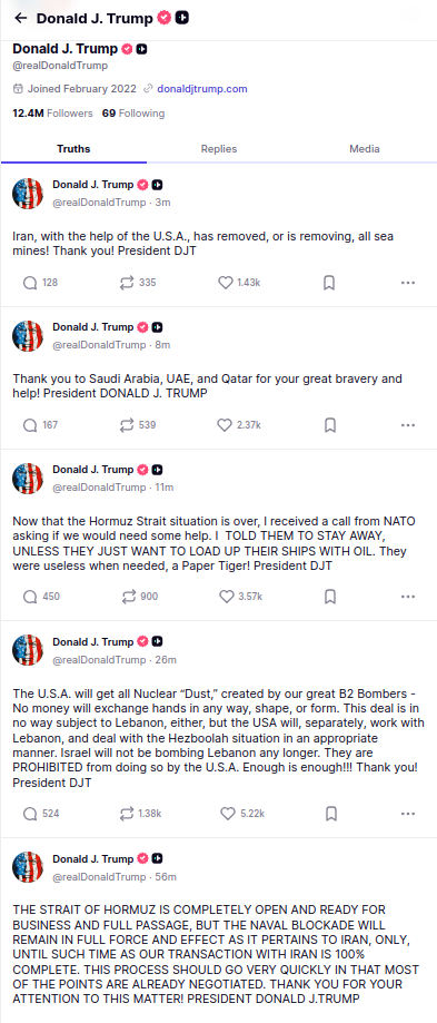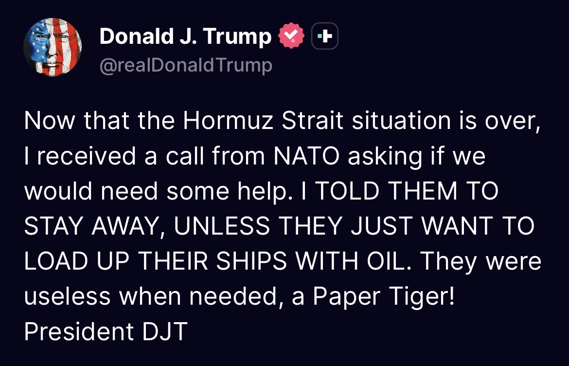 >tweetNow that the Hormuz Strait situation is over, I received a call from NATO asking if we would need some help. I TOLD THEM TO STAY AWAY, UNLESS THEY JUST WANT TO LOAD UP THEIR SHIPS WITH OIL. They were useless when needed, a Paper Tiger! President DJTThank you to Saudi Arabia, UAE, and Qatar for your great bravery and help! President DONALD J. TRUMP