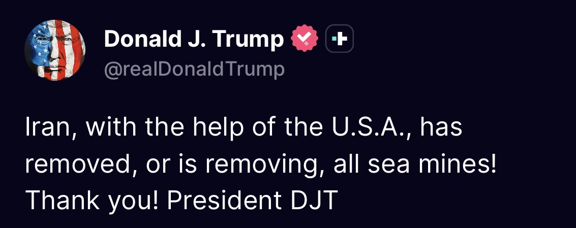 >tweetIran, with the help of the U.S.A., has removed, or is removing, all sea mines! Thank you! President DJT