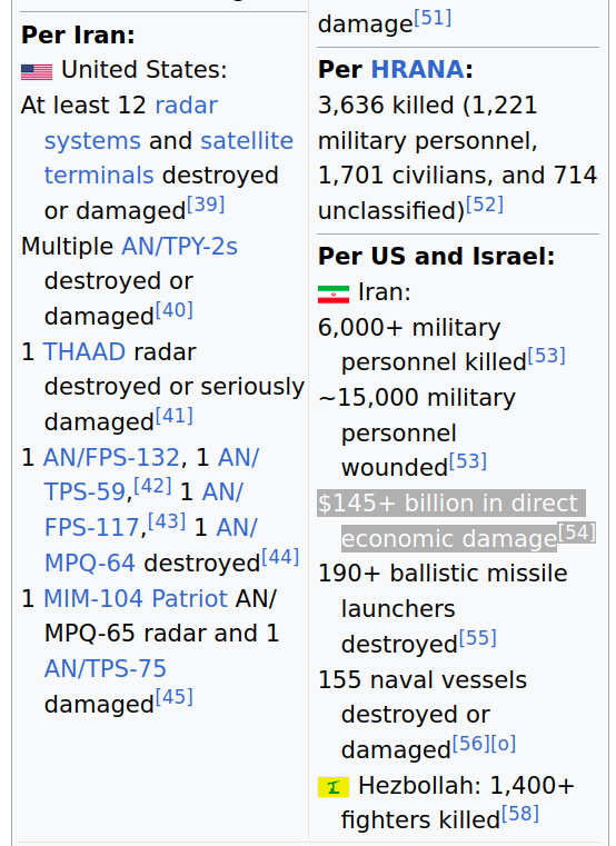 >>533325442>looks like someone read my economic analysis in the wikipedia screenshot thread about how much this war cost.I took the ~200bil Iran defense request and added the $50bil in reparations.Different math, same result, which I find interesting.