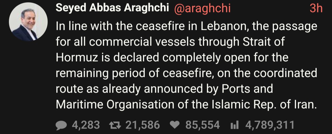 >>533328549Open in the Iranian route, maybe without a toll, for the current ceasefire. If the firing unceases then this certainly goes away. But they have yet to announce a permanent agreement.