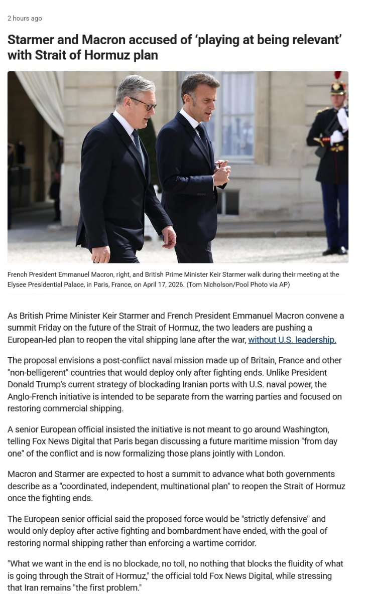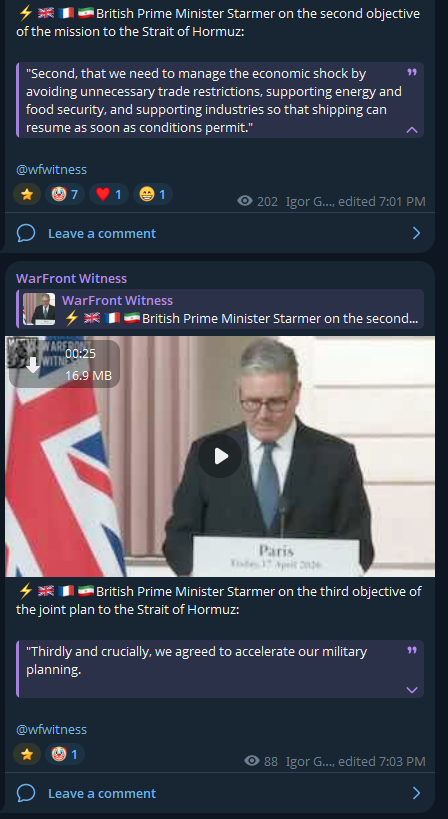 British Prime Minister Starmer believes that the announcement of the reopening of the Strait of Hormuz reinforces the work they have been doing putting together a joint plan with France."We welcome the announcement that was made during our meeting, but we need to make sure that that is both lasting and a workable proposal. And if anything, it reinforces the need for the work that we've been doing this afternoon because we're very clear that the mission that we're putting together is a defensive mission that comes after a ceasefire." British Prime Minister Starmer on the first objective of the joint plan with France to ensure freedom of navigation in the Strait of Hormuz:"And there are a number of elements. First, to deliver the diplomatic push for peace based on the fundamental principle that the strait should be reopened immediately with no tolls and no restrictions. And there was absolute unity on those points across all of the states attending today. And that transcends the other differences that countries who were with us this afternoon may have because the whole world needs to see a solution here."British Prime Minister Starmer on the second objective of the mission to the Strait of Hormuz:"Second, that we need to manage the economic shock by avoiding unnecessary trade restrictions, supporting energy and food security, and supporting industries so that shipping can resume as soon as conditions permit."British Prime Minister Starmer on the third objective of the joint plan to the Strait of Hormuz:"Thirdly and crucially, we agreed to accelerate our military planning. I can confirm that along with France, The UK will lead a multinational mission to protect freedom of navigation as soon as conditions allow. This will be strictly peaceful and defensive as a mission to reassure commercial shipping and support mine clearance."