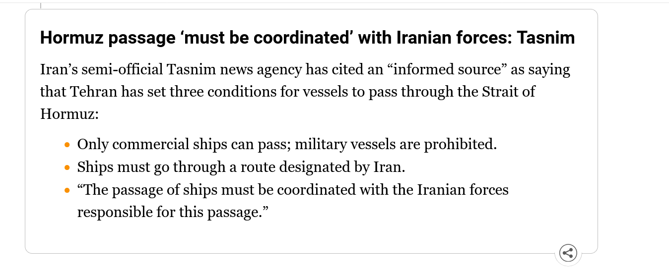 Iran has set three conditions for vessel transit: Ships must be commercial (no military vessels) and not linked to hostile countries; they must use a route designated by Iran; and passage must be coordinated with Iranian forces – a management role CENTCOM had previously acknowledged for the IRGC. If the US naval blockade continues, it will be considered a ceasefire violation and the strait will be closed.this is not the win Trumpclaimed