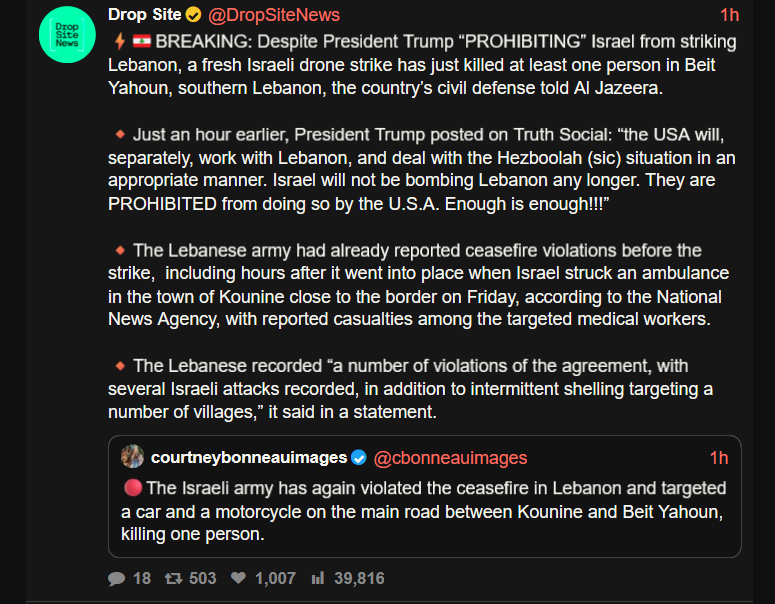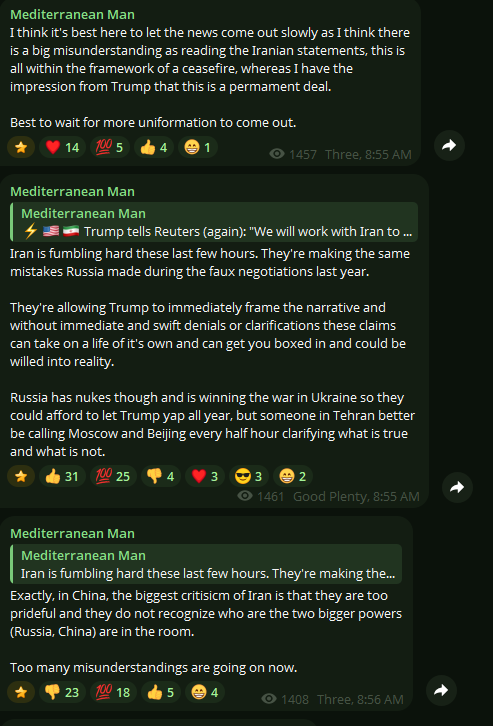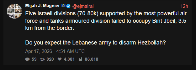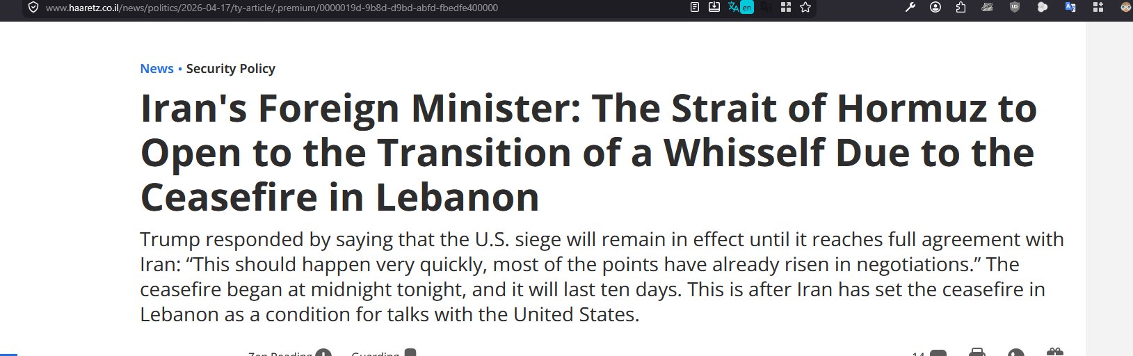 Previous: >>533323948Day: 9 of the 14-day ceasefire™ periodDay: 47 of the 1 day Special Military Operation to Decapitate Iran™Trump War Tantrum / Cope Counter: 30+ https://litter.catbox.moe/f0hmqh.txt▶RECENT:>FRIDAY TruthSocial Frenzy by Trump. Conradictions GALORE. >Trumps statements are not confirmed by the opposing parties, both Israelis and Iranians.>Israelis are not happy about the rumors of peace and started complaining again.>Conflicting reports of the strait being open. Iran claims they are open to prevent Israel attaking Lebanon, while Trump claims Lebanon is not part of the deal.>Intense Israeli artillery shelling of Khiam, Debbine and southeast Lebanon, less than 30 minutes into the ceasefire.>Lebanon ceasefire went into effect, APR 16th 21:00 UTC.>Hezbollah launched a large barrage towards Shelomi and Nahariyya.>Several impacts in Karmiel.>Hezbollah continues to bomb northern Israel until the ceasefire goes into effect.>Last US troops leave Syria.>US & Iran ceasefire is set to expire on April 22.▶WARNING:>Do not trust any "happenings" without link/proof>Uкraine / Яussia discussions belong in uнg or cнug▶Thread Theme:https://www.youtube.com/watch?v=hZj0hBqSkKM▶Oil:>https://oilprice.com/oil-price-charts/▶Kino:https://files.catbox.moe/jg9rat.mp4https://files.catbox.moe/fx86zj.mp4https://files.catbox.moe/cbd7ug.mp4https://files.catbox.moe/2hwzcx.mp4https://files.catbox.moe/smmsfw.mp4https://files.catbox.moe/x0fbgv.mp4https://files.catbox.moe/20lpu8.mp4https://files.catbox.moe/86yxn2.mp4▶Live-streams:https://www.youtube.com/watch?v=4E-iFtUM2kkhttps://www.youtube.com/watch?v=TdcrT5OcS9chttps://www.youtube.com/watch?v=53G-Oy4r6M4▶Telegram Channelshttps://rentry.org/tgnews▶Israel Rocket Alertshttps://www.tzevaadom.co.il/en/▶Air Traffichttps://www.flightradar24.com/https://flightaware.com/livehttps://globe.adsbexchange.com/▶Maritime Traffichttps://www.marinetraffic.com/https://www.vesselfinder.com/