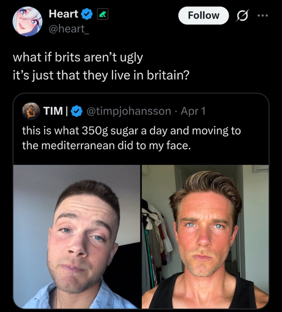 >>533330900Like others said its the Sun. Those brit islands are miserable lightless shitholes. Med BVLLS can't stop winning.