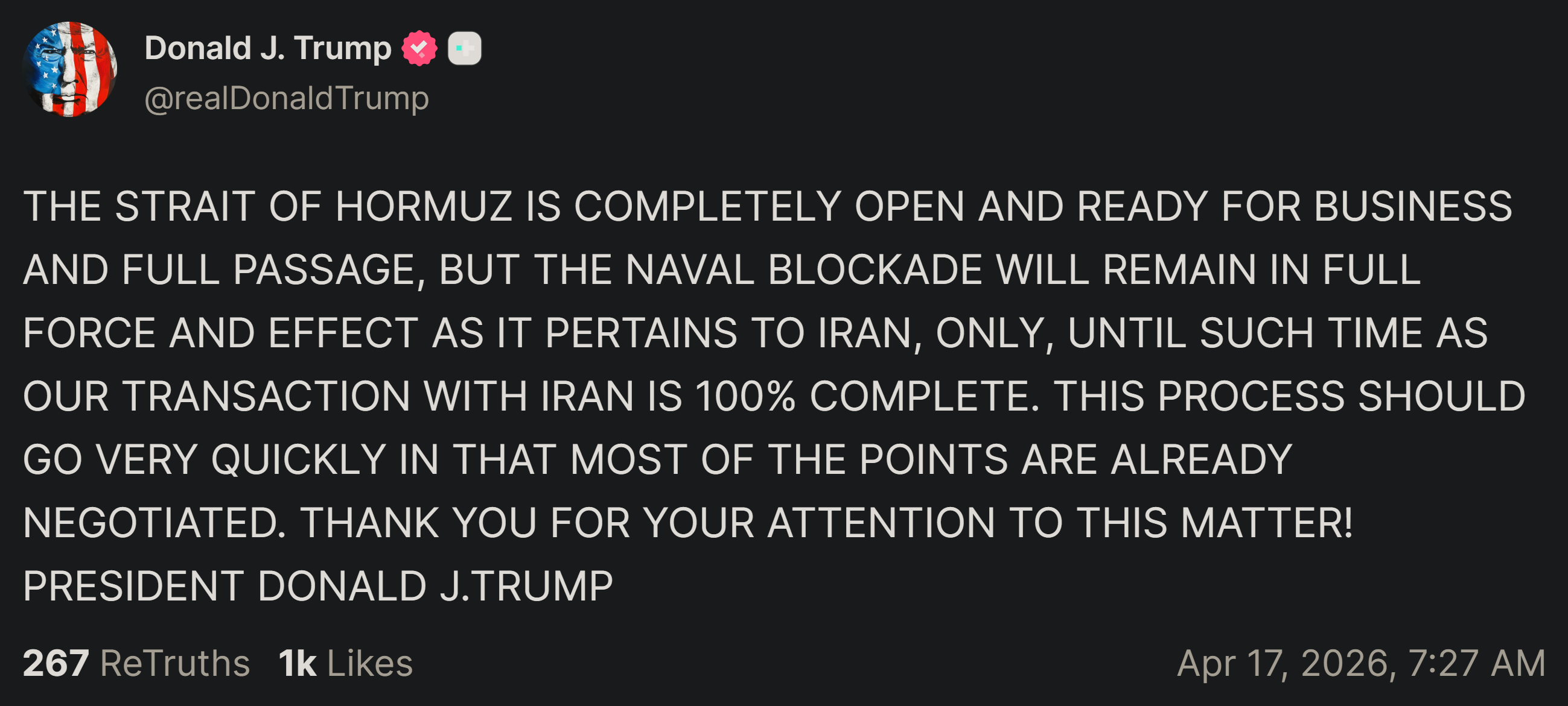 >No Iranian toll>US blockade remainsIf this situation holds for even 2 days we're going to have to come up with a term more severe than buck breaking.