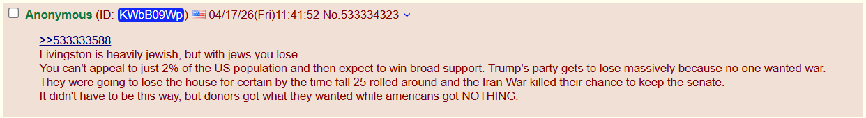 >>533333588Livingston is heavily jewish, but with jews you lose.You can't appeal to just 2% of the US population and then expect to win broad support. Trump's party gets to lose massively because no one wanted war. They were going to lose the house for certain by the time fall 25 rolled around and the Iran War killed their chance to keep the senate.It didn't have to be this way, but donors got what they wanted while americans got NOTHING.