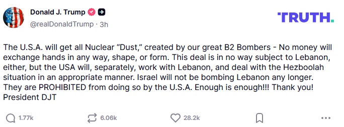 >Trump orders Israel not to bomb Lebanon