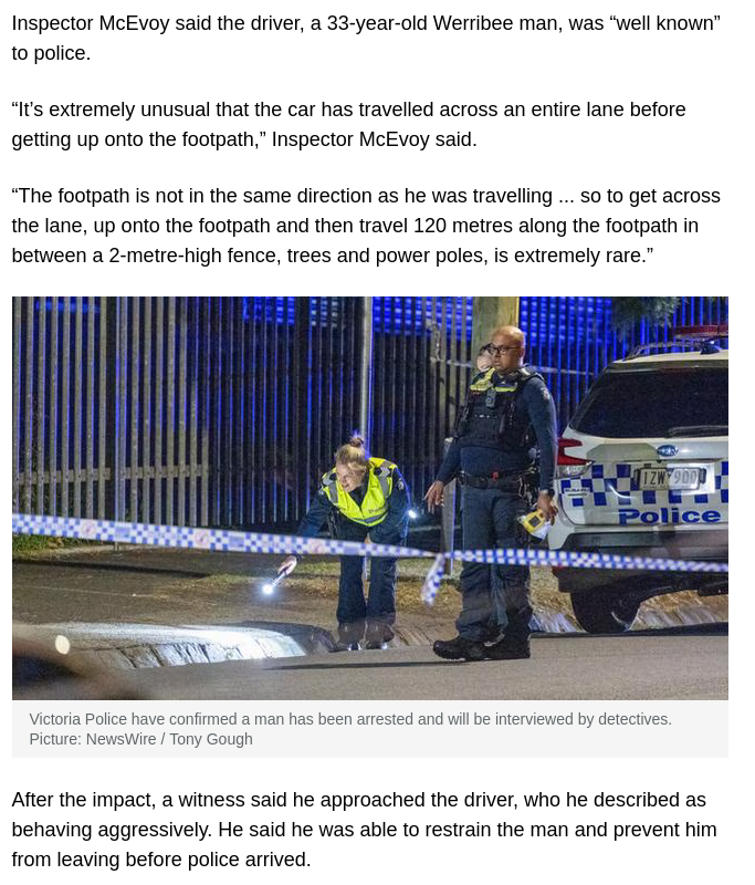 >Inspector McEvoy said the driver was a 33-year-old man from the Werribee area who was "well known" to police and the Toyota hatchback he was driving appeared to be a rental vehicle.probably sudo on bail