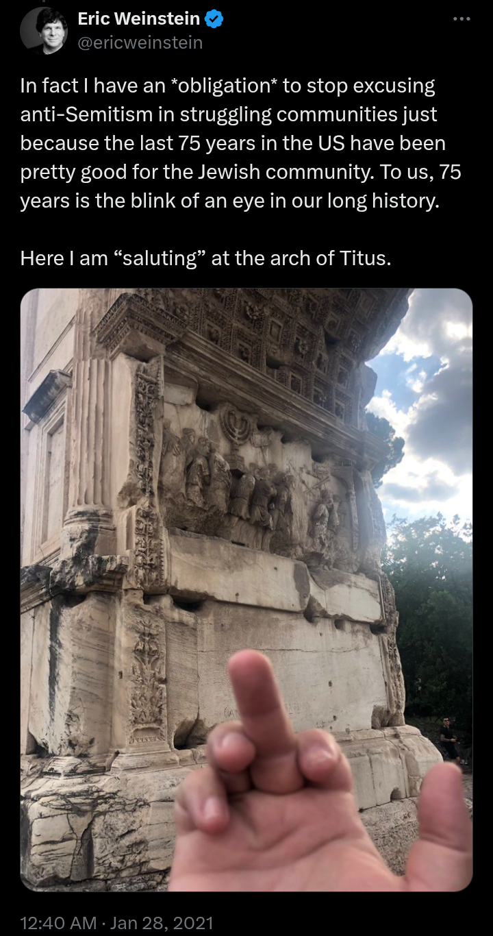 >>533349351This. It’s a reversion of the Arch of Titus, which depicted the sacking of Jerusalem. Do not for a second think the Italian peninsula is out of the minds of Israelis either. They will never forget how Rome continually humiliated them. We’ve been played hardcore. Especially those of us who actually voted for the orange fuck. The bottom line is, Israel needs to be completely obliterated into nothingness.