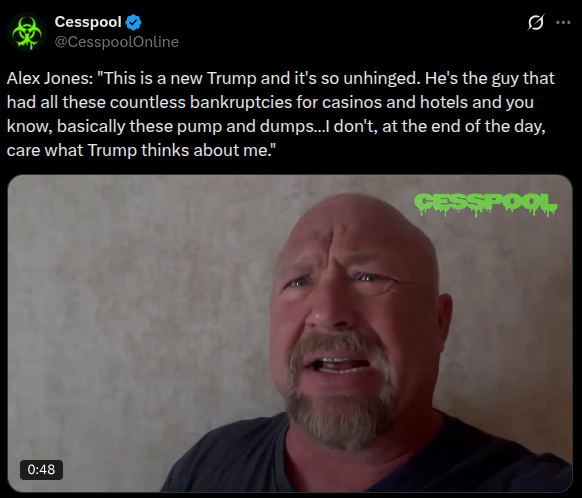 I can imagine how he must feel. Like a man who has never broken the law and has always supported and trusted the police gets into situation where police pull a gun on him, throw him into the ground and threaten him. Suddenly you're all alone with the full force of the state coming down on you and treating you like a criminal. You feel crushed, betrayed, your whole world is coming down, you might even get hysterical. Now Alex Jones, long time ally said something critical about Trump for a first time and Trump comes down on him hard, belittles his entire lifes work and throws him aside like a bad habit. I can imagine the betrayal, hurt and confusion.