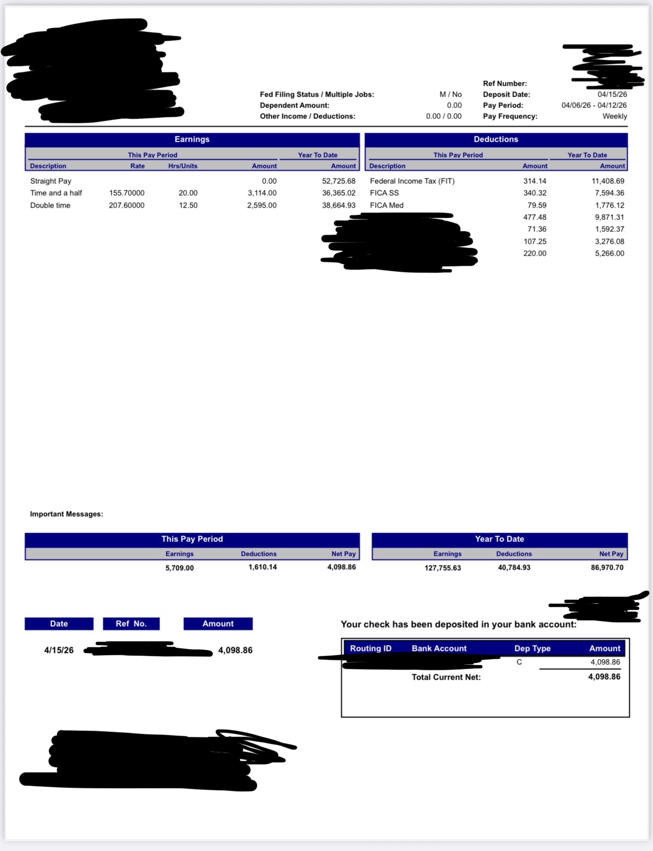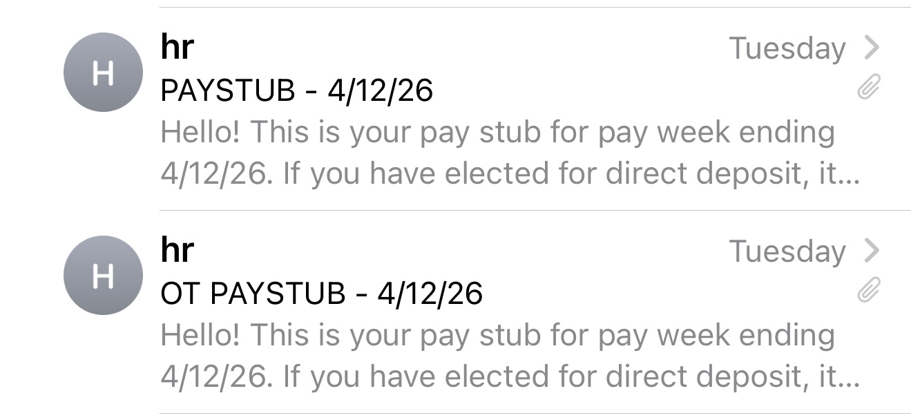 My weekly checks are split into a 40 hour straight time check and then an OT/DT check.