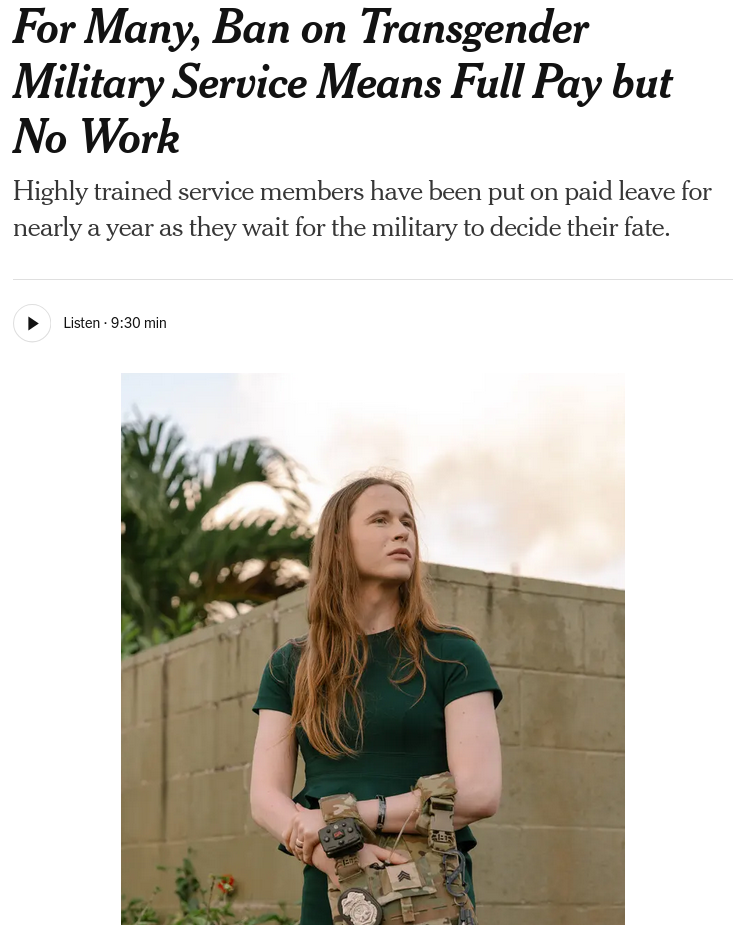 https://archive.is/oMJ7P> Highly trained service members have been put on paid leave for nearly a year as they wait for the military to decide their fate. Some doctors in the military are being told to not see patients. Pilots are grounded. A police investigator was forced to abandon her cases. An aircraft carrier headed to war without a critical nuclear reactor supervisor. Those professionals and thousands of others have been pulled from military jobs for one reason: They are transgender.> President Trump ordered a ban on trans service members days after taking office, saying it was necessary to improve operations and cut costs in the military. Instead trans troops say, highly trained professionals have been removed from positions with little planning, leaving their teams short-handed..> When they disappeared from their jobs, they stayed on Defense Department books for months unable to be replaced and being paid to do nothing. “It is the biggest waste I’ve ever seen,” said Capt. Katie Benn, a decorated air defense officer who was has served in the Army for 13 years. “I’ve proven I’m good at my job. They just won’t let me do it.”> The captain was scheduled to deploy to Iraq in June. She had broken her apartment lease near Fort Campbell, Ky., and packed her duffel bags when she was abruptly told by her commander that she couldn’t go because she was trans. Since then, she has been sitting at home. She keeps her duffels packed, hoping that the Army will call and tell her to deploy. No one has.> “I’m trained to take care of soldiers, and my soldiers are over there in harm’s way,” she said. “It kills me to not be there with them.”> The Defense Department has stayed silent on how many troops have been forced out, how the ban has affected operations, and how much has been spent on severance checks and paid leave. The department and all of its service branches declined to comment.
