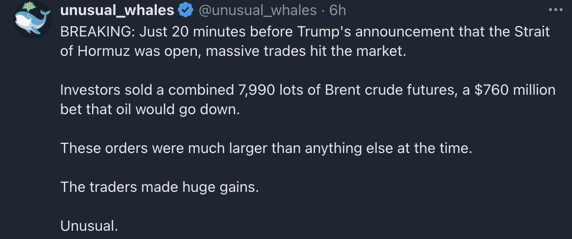 >>533362284>Is there never a "cry wolf" point where the market stop believing his blatantly false statements?The way they have HFT algos set up to react to headlines without taking a minute to check AIS traffic, if some fund said "fuck you" and went long on oil, they'd get margin called and liquidated.That's why Trump's market manipulation through both his lies that make it to the headlines and what appear to be shorts by insiders on oil futures is so incredibly destructive.