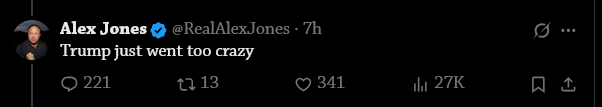 lmao Alex Jones is continuing to crash outhttps://x.com/RealAlexJones/status/2045229879537603047Very sad, I used to think he was a real one