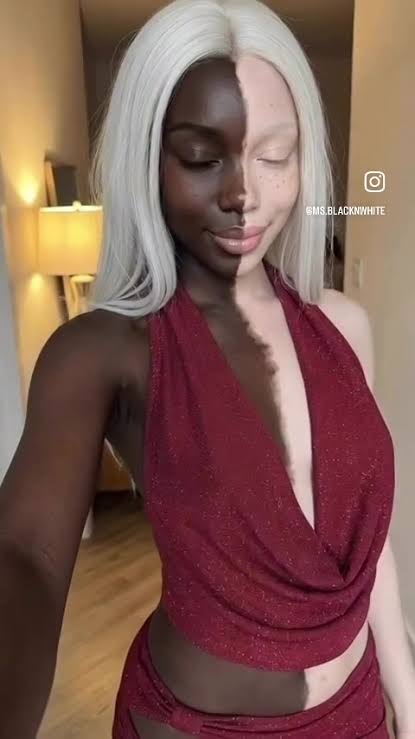I wonder if her vulva had the same treatment, one labia pair black one white, and of course her behind as well. Either if this is some odd genetic lottery or she has specifically had treatments done to remove pigmentation it is fascinating.