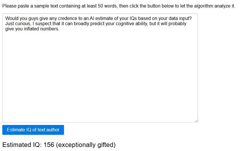 Would you guys give any credence to an AI estimate of your IQs based on your data input? Just curious, I suspect that it can broadly predict your cognitive ability, but it will probably give you inflated numbers.
