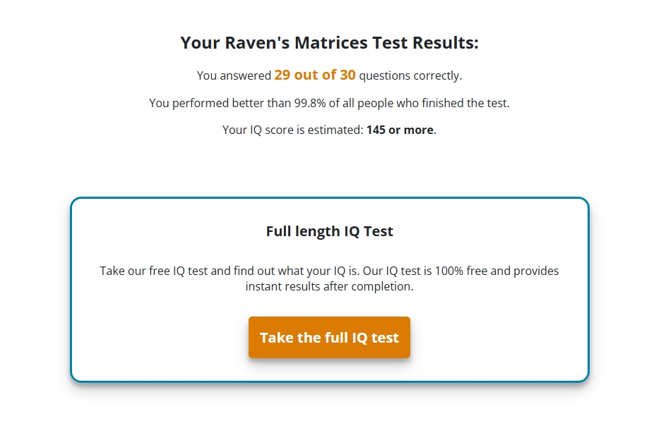 >>533383959Oh good, you're not a subhuman. Now get it administered by a psych, the full test is somewhat longer and more precise for higher iqs, if you're curious about your actual number.