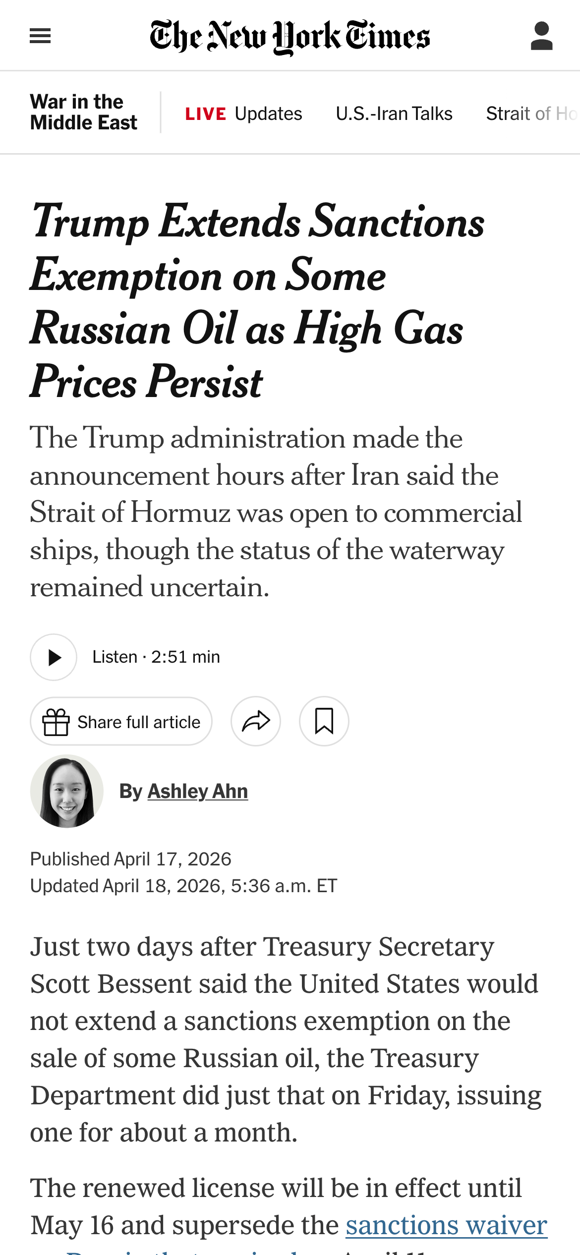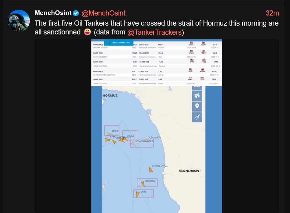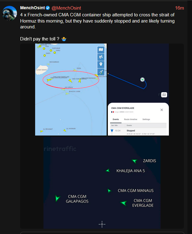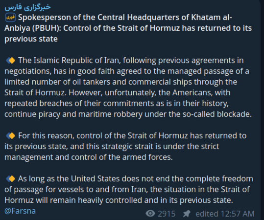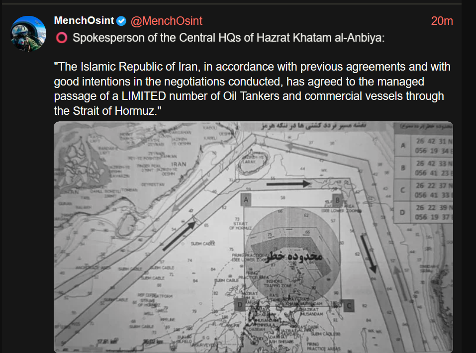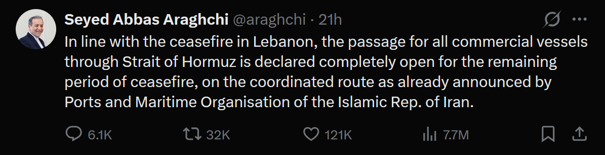 >Conflicting reports of the strait being open. Iran claims they are open to prevent Israel attacking Lebanon, while Trump claims Lebanon is not part of the deal.