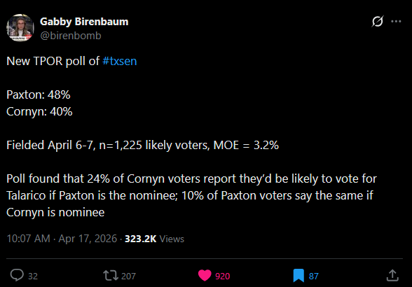>24% of Cornyn voters say they will vote for Talarico if Paxton winsYeah Texas is 100% flipping blue.