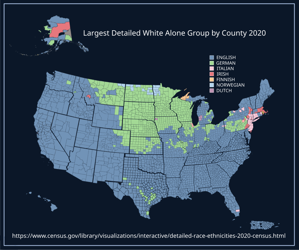 >>533374813It looks more like this, and in 2030 will be much smaller again, and is shrinking all of the time as Boomers die out. You had a good 30 years from 1990-2020 of larping as the main white demographic, but in all of those Census surveys Germans were declining, as it was always a bullshit identity based on being partially German, and the Census questionnaire being deliberately altered to effect the outcomes (such as removing English as an ethnicity on the 'examples' while listing German first, which was discussed after the 1980 census had English at #1, so it was a deliberate policy, then the addition of the American ethnicity in 1990 for the same reason. Most Midwest states have English as their official language, and everyone speaks English, and Germans have no states, no official language in any state, nor do any states have German law.So not only do Germans have Europes lowest birthrates, and a country 1/3 smaller than it was 100 years ago, you put all of your eggs in the basket of desperately wanting America to be German but even the most German states are English in every way, from dominating the top 1000 surnames, to language and culture. It is the total cultural and genetic victory of English people over Germans, that even as Germans are the #2 demographic in America they're still mixed with Anglos, still speaking English and living in an republic founded by Brits. When German Americans celebrate July 4th, they celebrate British colonists defeating a Hannovarian monarch and his German mercenaries. In fact the only German ever mentioned anywhere in the founding documents of America, is the tyrant King George III.