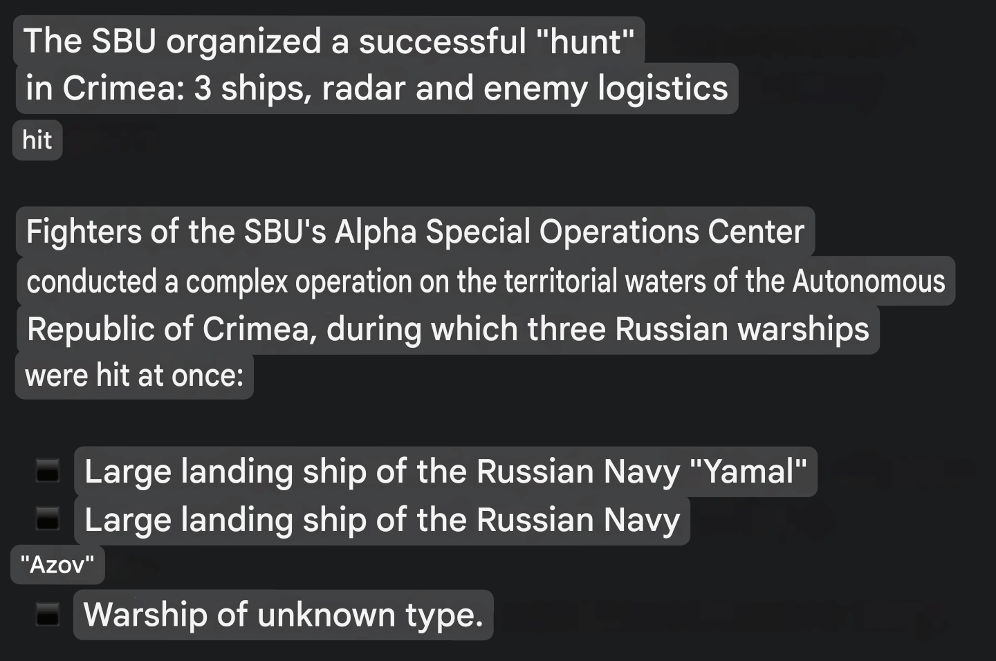 The SBU organized a successful "hunt" in Crimea: 3 ships, radar and enemy logistics were hit.• Large landing ship "Yamal".• Large landing ship "Azov".• A warship of an unknown type.• Damage of anti-sabotage boat of project 21980 "Grachonok".In addition, the SBU's "Alpha" drones damaged the antenna block of the "Dolphin" communication system, the MR-10M1 "Mys-M1" radar, and fuel tanks at the "Yugtorsan" oil depot.
