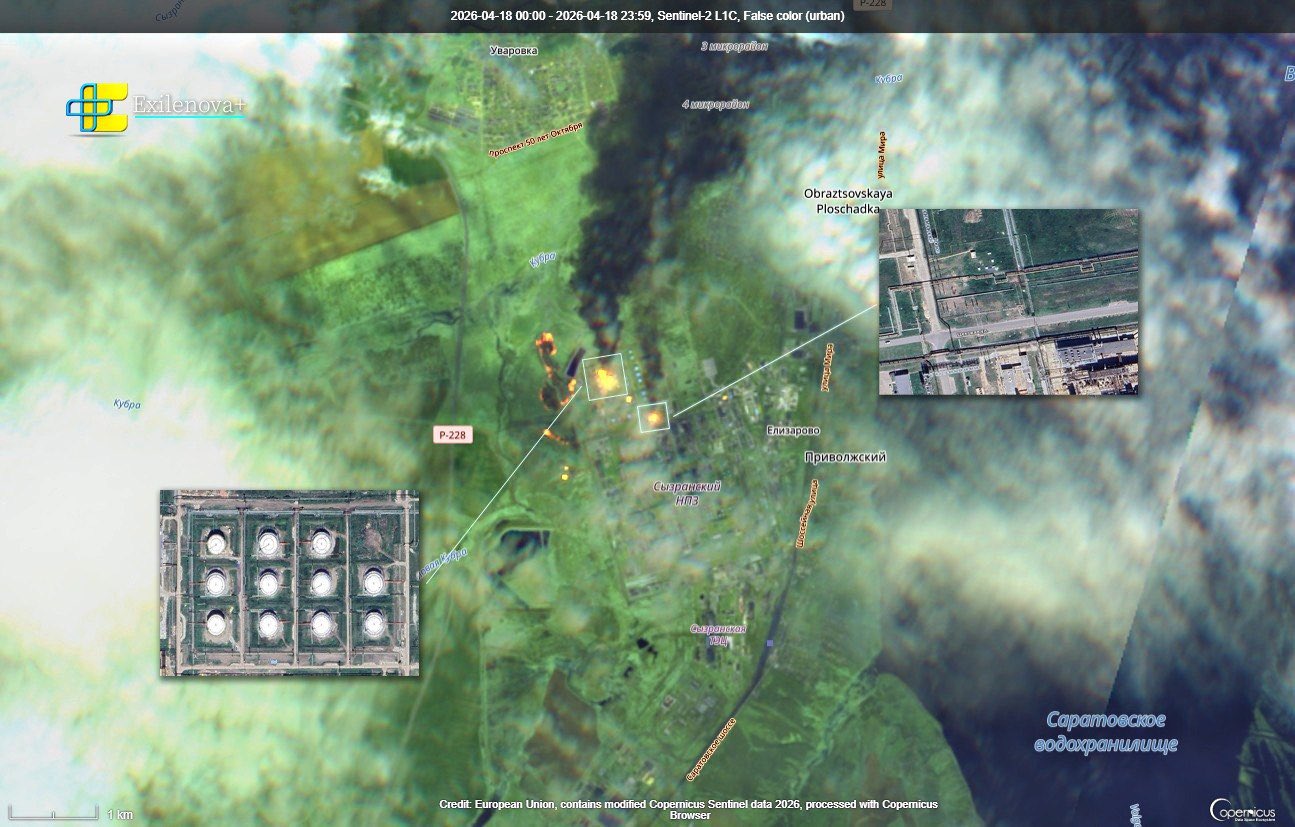 A preliminary low-quality image shows active burning in the tank farm area and along the pipeline infrastructure connecting key installations at the Syzran Refinery, - Exilenova