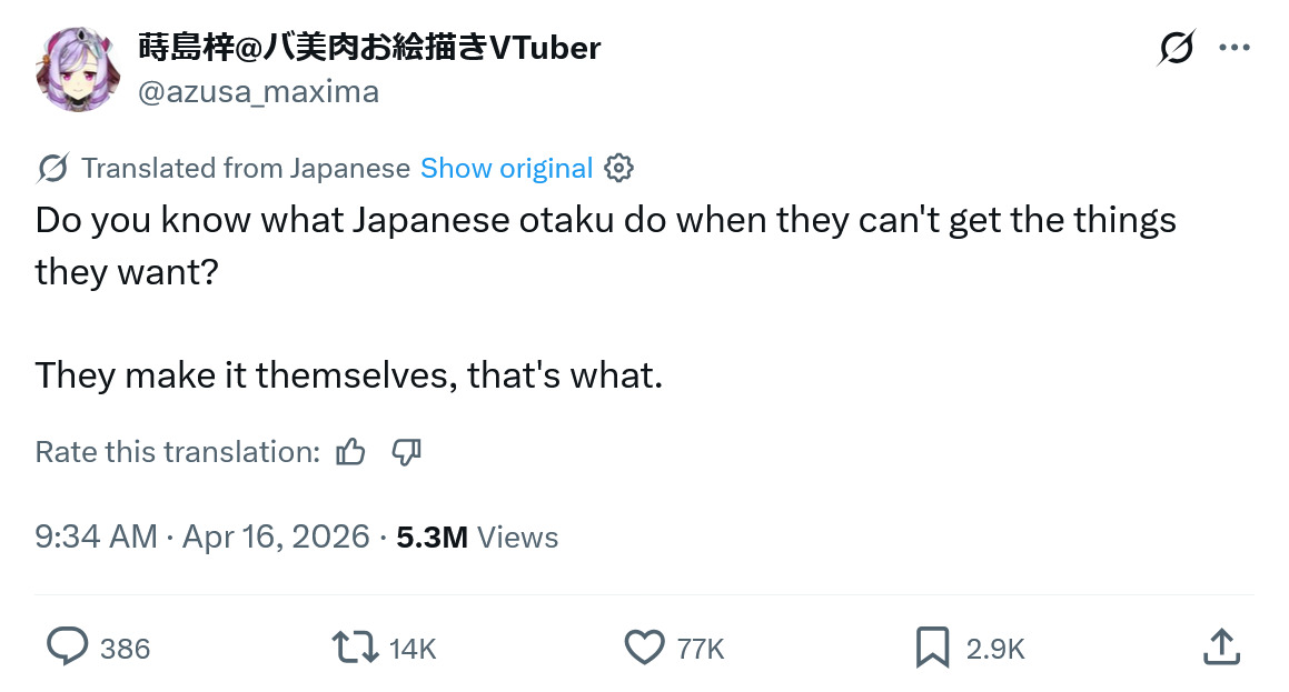 >>533379450>Otakus make it themselves*Western Weebs do their own scanlations**Western Weebs do their own distributions*>"N-no!! Not like that!!"Kek