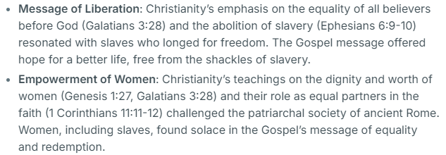 Imagine how radical Christianity must have been to introduce female slave leadership in a heirarchical male dominated Roman society.The Romans never gave women the vote.
