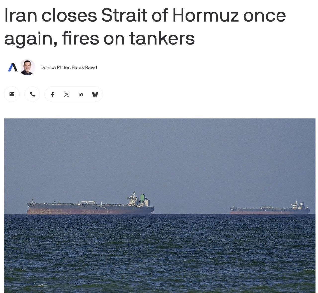 >Merchant ships attacked while attempting to transit the Strait of Hormuz — Reuters>At least three attacks on merchant ships have been recorded in the Strait of Hormuz. Two of them were Indian tankers, one of which was carrying 2 million barrels of Iraqi oil, according to Axios.>The US military is tracking Iranian attacks on two non-US vessels, the WSJ reports, citing a senior US official.