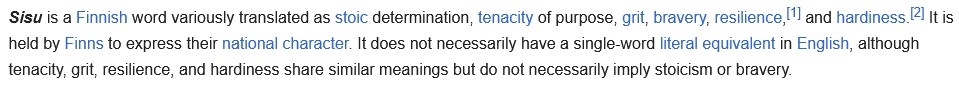 >>533398284Sisu is a word for what a sort of Finnish way of being, but it's hard to explain. It's not anything to do with military service.It's one of those words that doesn't have foreign equivalents, like gezellig.