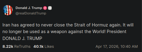 the funniest part is that the blame is entirely on him, Iran was going to actually open it but he either din't know blockades are an act of war and thus broke his own ceasefire or he thought he could just bullshit his way through it