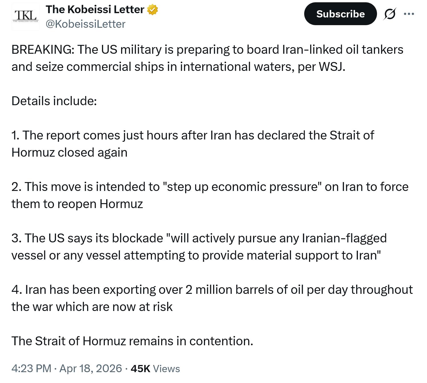 Audio of the Indian oil tanker Sanmar Herald pleading with Iranian forces to stop shooting at it in the Strait of Hormuz this morning.https://xcancel.com/Osinttechnical/status/2045503858130956788